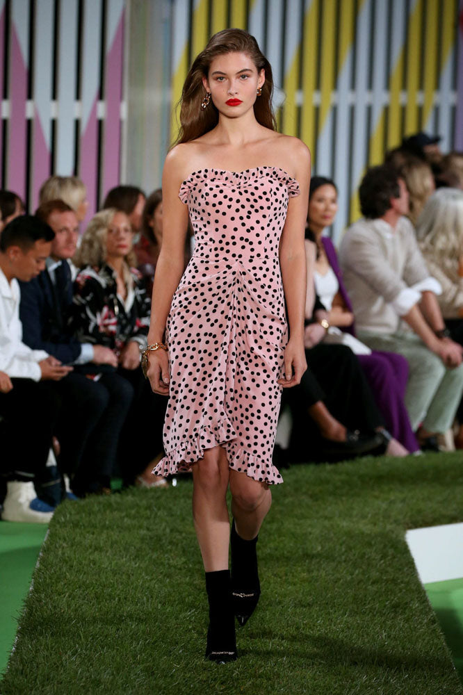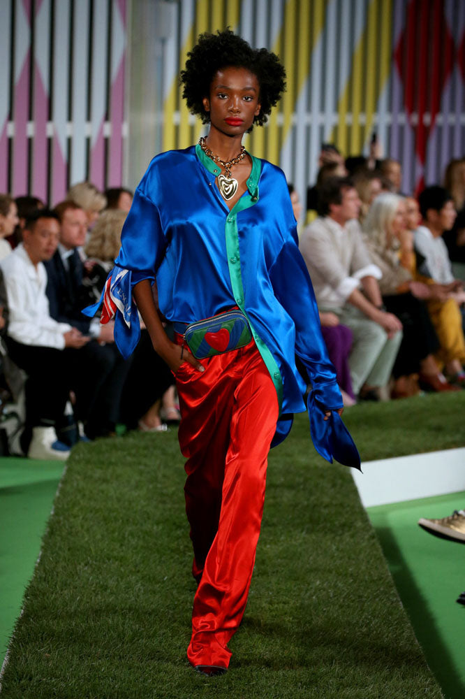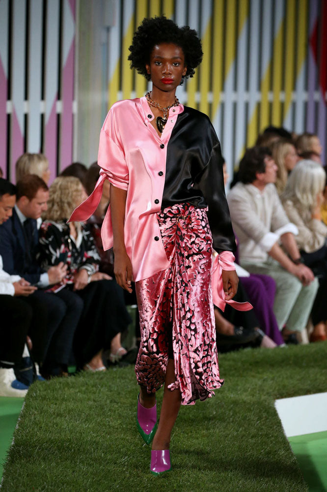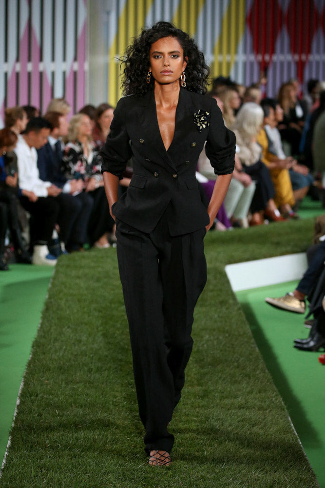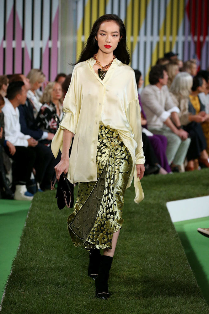 Für Escadas 40-jährige Jubiläumsshow auf der New York Fashion Week suchte Global Design Director Niall Sloan in den umfangreichen Archiven der Marke nach Inspiration. Er ließ sein ursprüngliches typografisches Logo aus dem Jahr 1989 wieder aufleben, um einen juwelenfarbenen Ledermantel zu kreieren, bezog sich mit seiner schulterfreien Schneiderkunst auf Prinzessin Diana und zollte mit seidenen, von Jockeys inspirierten Kleidern eine Hommage an Escadas Wurzeln im Reitsport.