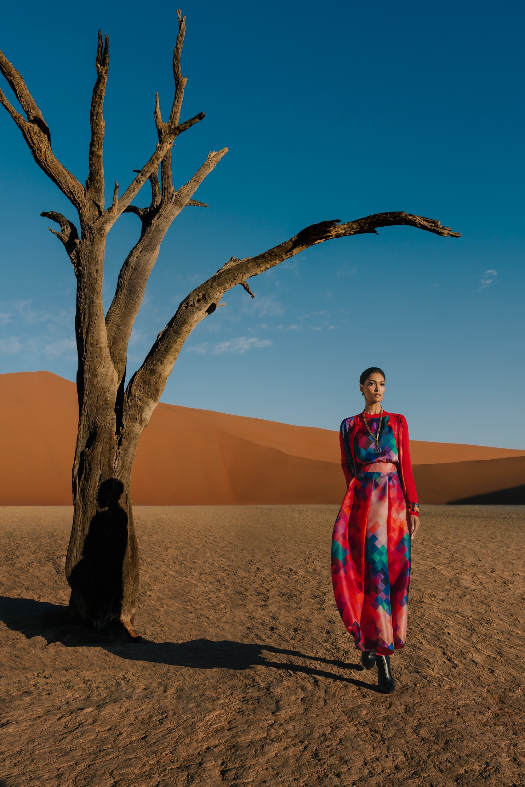 With each new season, the art of showcasing the collection in a mesmerizing setting becomes a source of joy. Here, amidst the haunting beauty of Deadvlei, the essence of ESCADA comes alive, harmonizing effortlessly with the rugged yet enchanting environment.